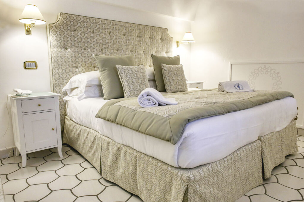 La Duchessa è una Suite raffinata, dall’eleganza discreta, luminosa, il suo pavimento ha delle maioliche di forma particolare in bianco, ha un’area living separata dalla zona letto.